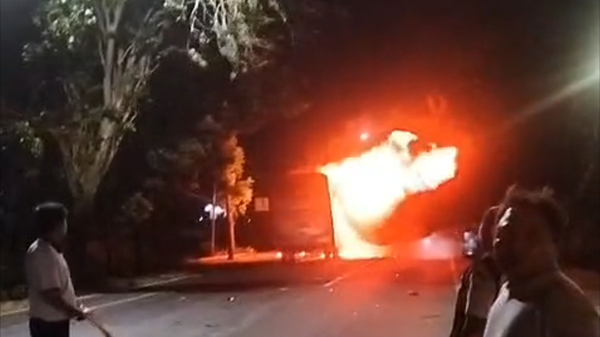 Tak lama berselang, kobaran api dari bawah mesin makin membesar dan membakar habis seluruh bagian bus.