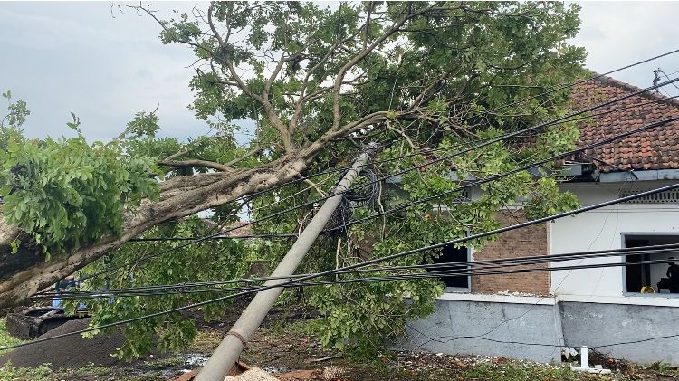 Dusun Sugihwaras, Desa Bandung, Kecamatan Diwek — Pohon tumbang menimpa teras rumah warga (sedang ditangani).